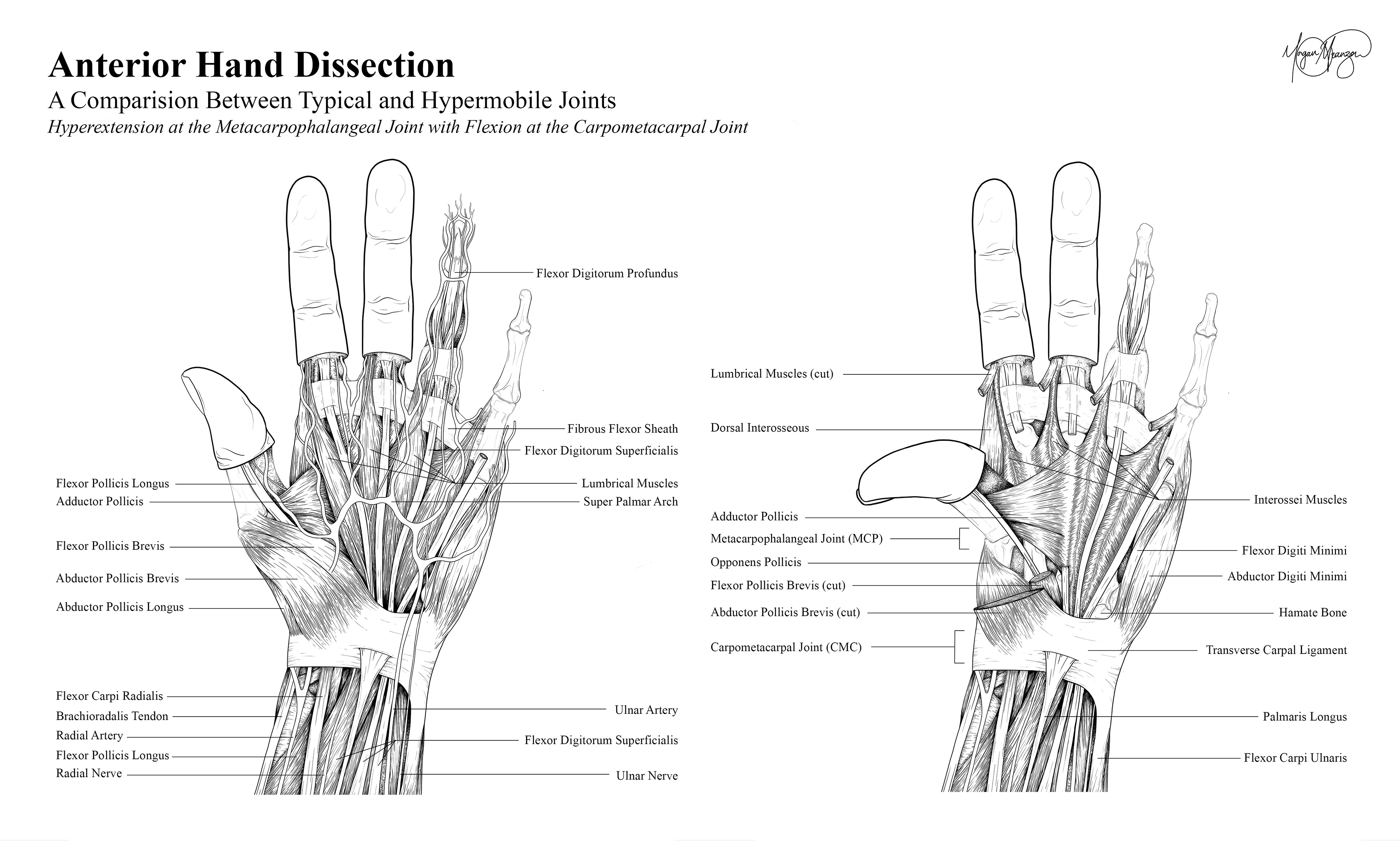 Anterior dissection drawing of the hand, comparing a typical hand to one with hypermobility. The hypermobility is shown through hyperextension of the metacarpophalangeal joint with some flexion at the carpometacarpal joint. In patients with hEDS or hypermobility, joints have a higher range of motion as a result of weak muscle and tendon support at the joint, causing discomfort, fatigue, and instability that can cause longterm issues.